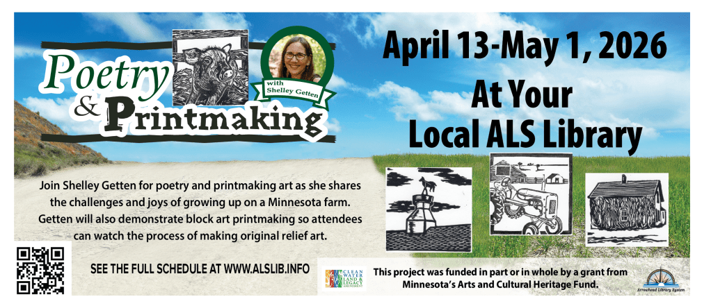 Through the poetry and images from her collection, Of Cows and Crows (Nodin Press 2024) Shelley will highlight the challenges and joys of growing up on a Minnesota farm. Getten will also discuss her creative writing process and how she made the block print illustrations and cover art for the book. This program is one hour long and is appropriate for adults, teens, and children 8 years and up.