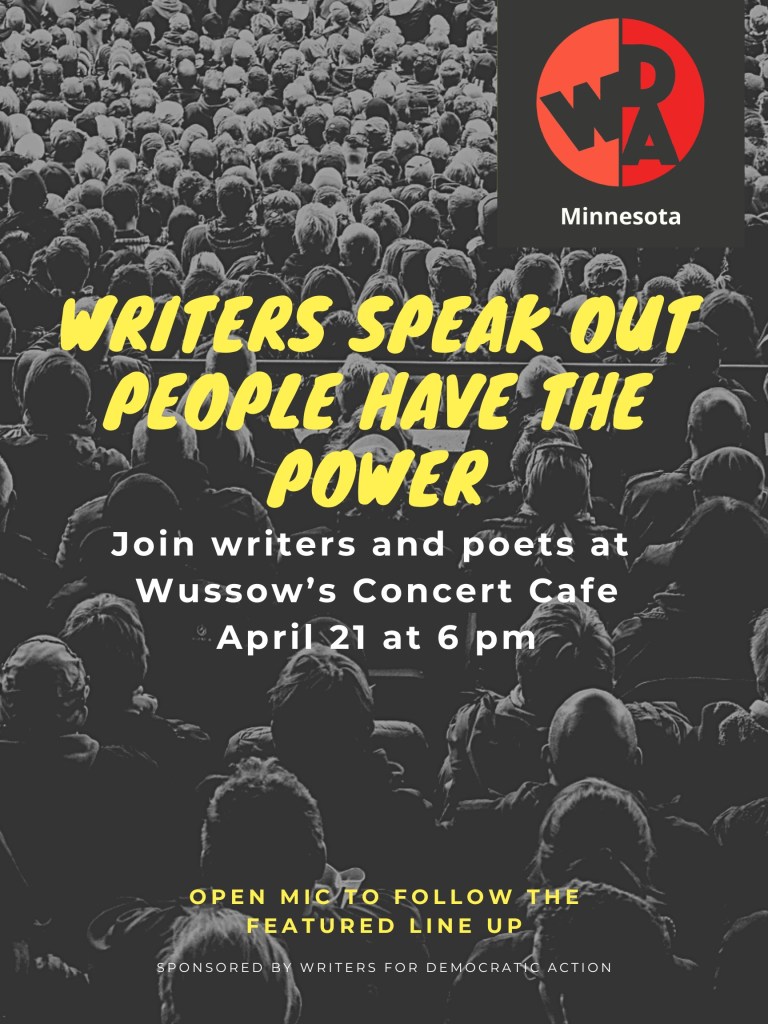 Join featured writers and poets on April 21 at 6 pm at Wussow’s Concert Cafe in support of “small d” democracy and civil rights. There will be an open mic. We invite you to bring a short piece of writing or poem of witness, a personal testimony, a call to action, a vision for a better future, a balm for hard times, or a blessing! Hosted by Sheila Packa, Liz Minette, and Zomi Bloom.