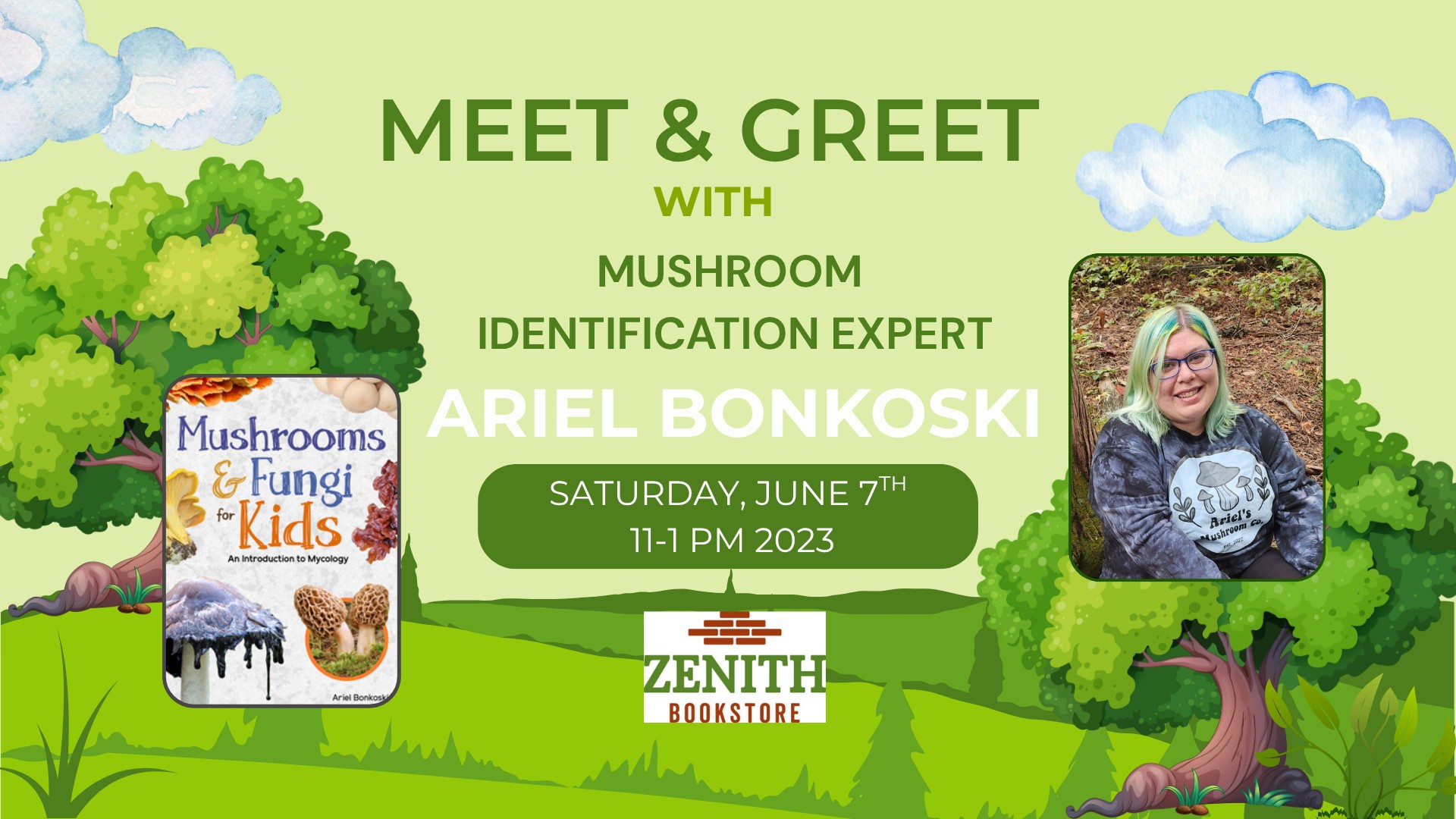Join us on Saturday, June 7th 11 AM-1 PM for a Meet & Greet with mushroom identification expert, Ariel Bonkoski. Ariel will sign her new book Mushrooms & Fungi for Kids, talk with guests one-on-one, and bring some of her mushrooms. https://zenithbookstore.com/events/2704220250607