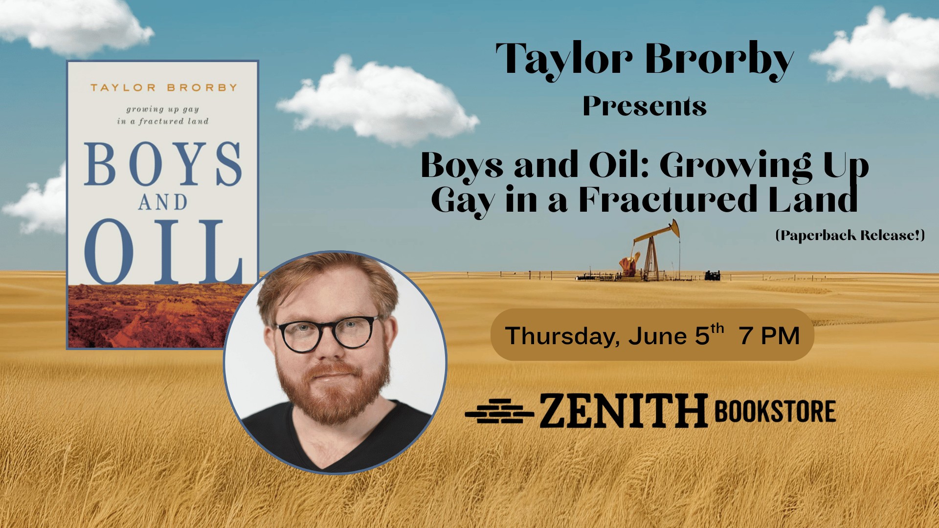 Zenith Bookstore is delighted to welcome author, educator, and environmentalist Taylor Brorby on Thursday, June 5th at 7pm. Taylor will share from his courageous memoir Boys and Oil: Growing Up Gay in a Fractured Land which will be released in paperback in early June. Taylor will discuss his book, career, and answer audience’s questions. Boys and Oil will be available for purchase, and he will personally sign copies. https://zenithbookstore.com/events/2596320250605