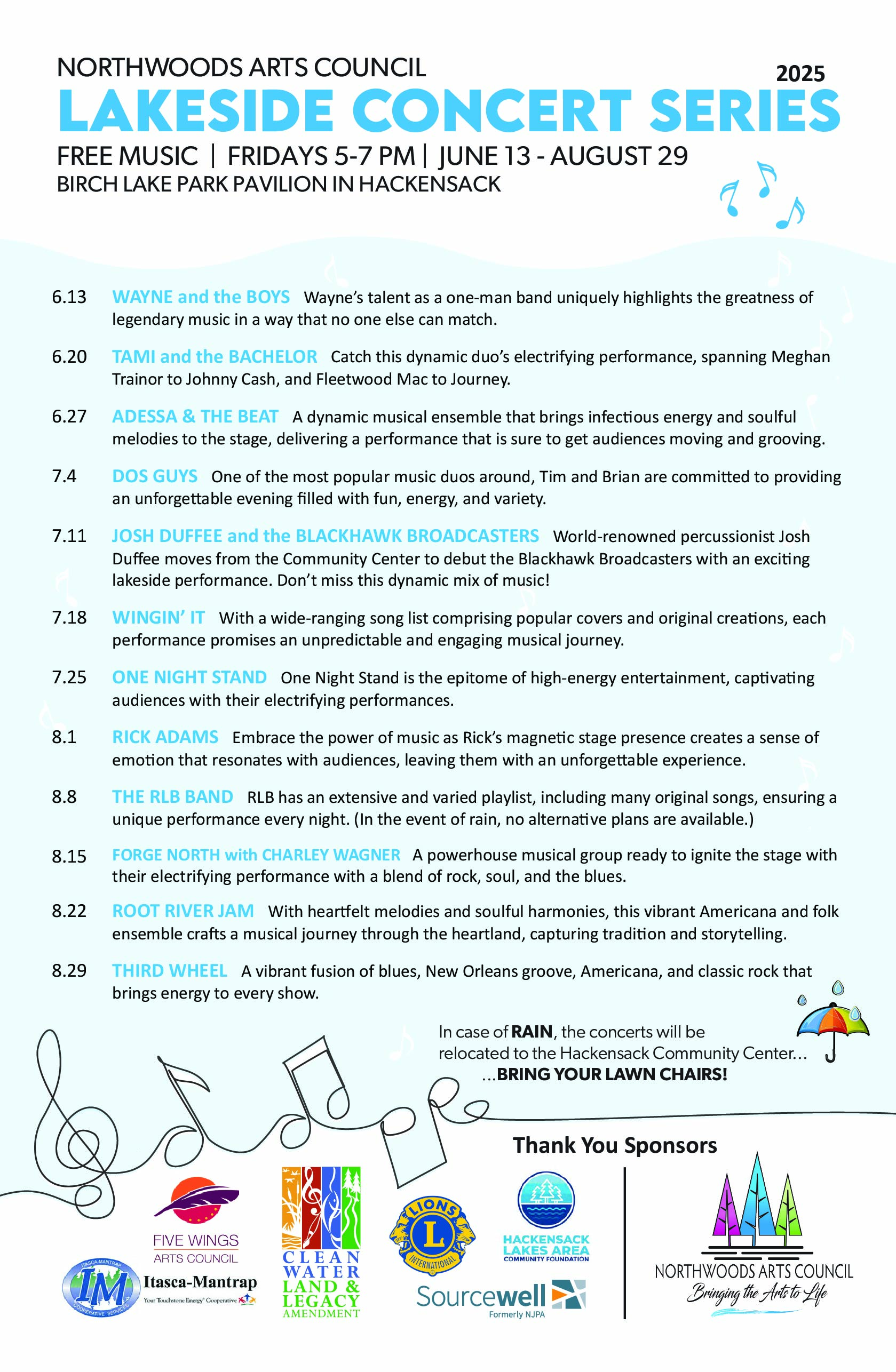 The 2025 Lakeside Concert Series runs from June 13 to August 29. It is held at Birch Lake Pavilion in downtown Hackensack by Birch Lake. Twelve bands are lined up for the concert series. Bring your lawn chair. Beverages and foods will be available for purchase.