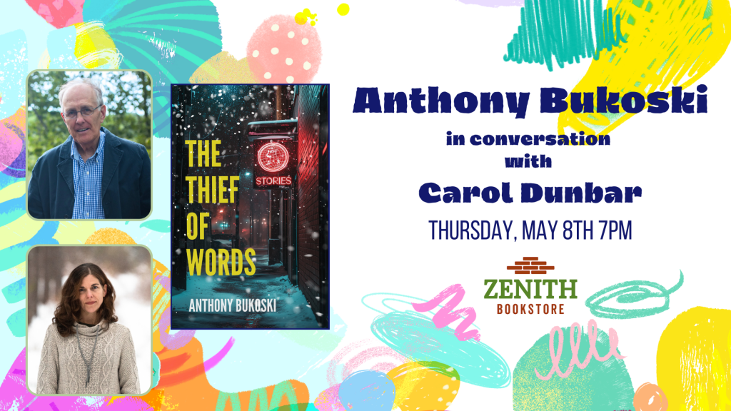 Join us as we welcome Twin Ports author Anthony Bukoski in conversation with fellow Wisconsin author Carol Dunbar on Thursday, May 8th at 7pm. Anthony will be sharing his brand-new book The Thief of Words. They will discuss his book, career, and other topics. There will also be a Q & A with the audience. Both Anthony’s books & Carol’s books will be available for purchase.