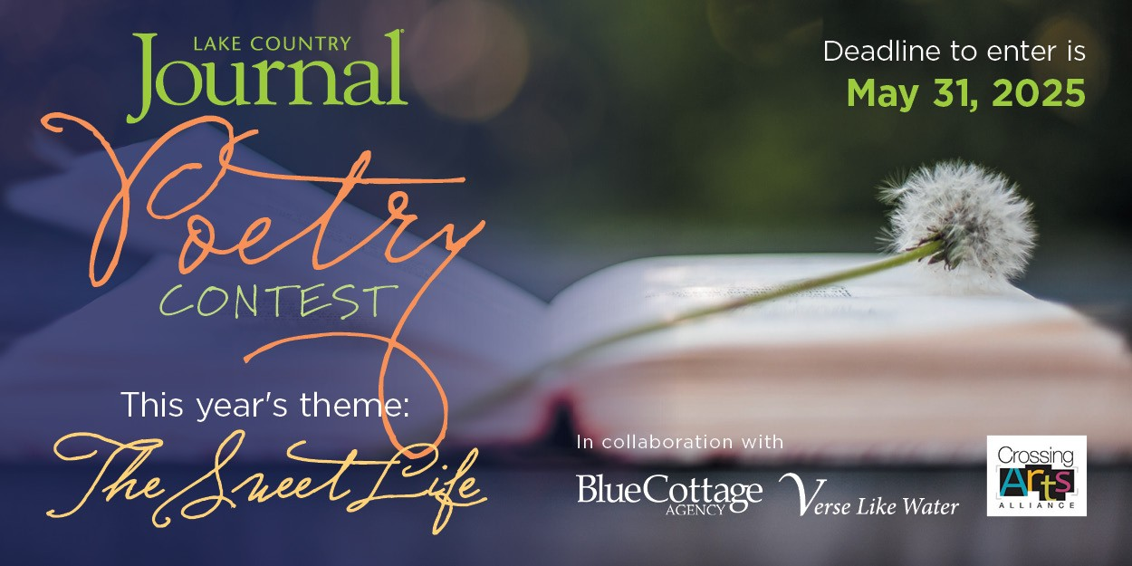 Lake Country Journal is pleased to announce our second annual poetry contest, with winners to be published in the Oct/Nov 2025 issue of Lake Country Journal. Cash prizes will be awarded to the top five poems. The theme for the contest is The Sweet Life. Poems will not be disqualified for not addressing the theme, but we appreciate poems that explore the theme, obliquely, directly, or metaphorically. You can find the rules and submit your poems on our website (lakecountryjournal.com). Select “Poetry Contest” under the “Contest” header. We look forward to reading your submissions!