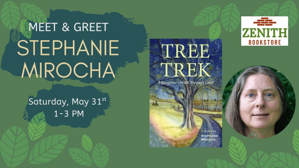 Zenith Bookstore is excited to welcome artist, children’s author/illustrator, and nature author Stephanie Mirocha on Saturday, May 31st 1-3pm. Stephanie will talk one-on-one with guests and personally autograph her book, Tree Trek: A Daughter’s Walk through Grief.