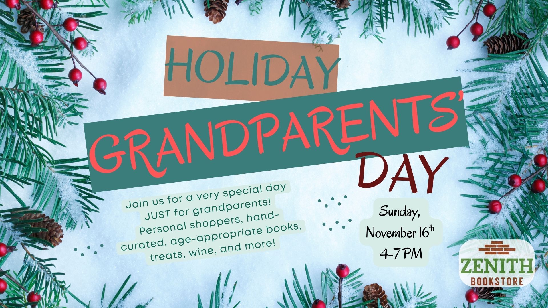 Join Zenith Bookstore for a very special day JUST for grandparents! On Sunday, November 16th, we are extending our hours to 4-7 PM to host our first Holiday Grandparent’s Day. Settle in for a cozy, quieter, less-rushed shopping experience with personal shoppers, hand-curated, age-appropriate book suggestions, delicious treats, wine, and more!