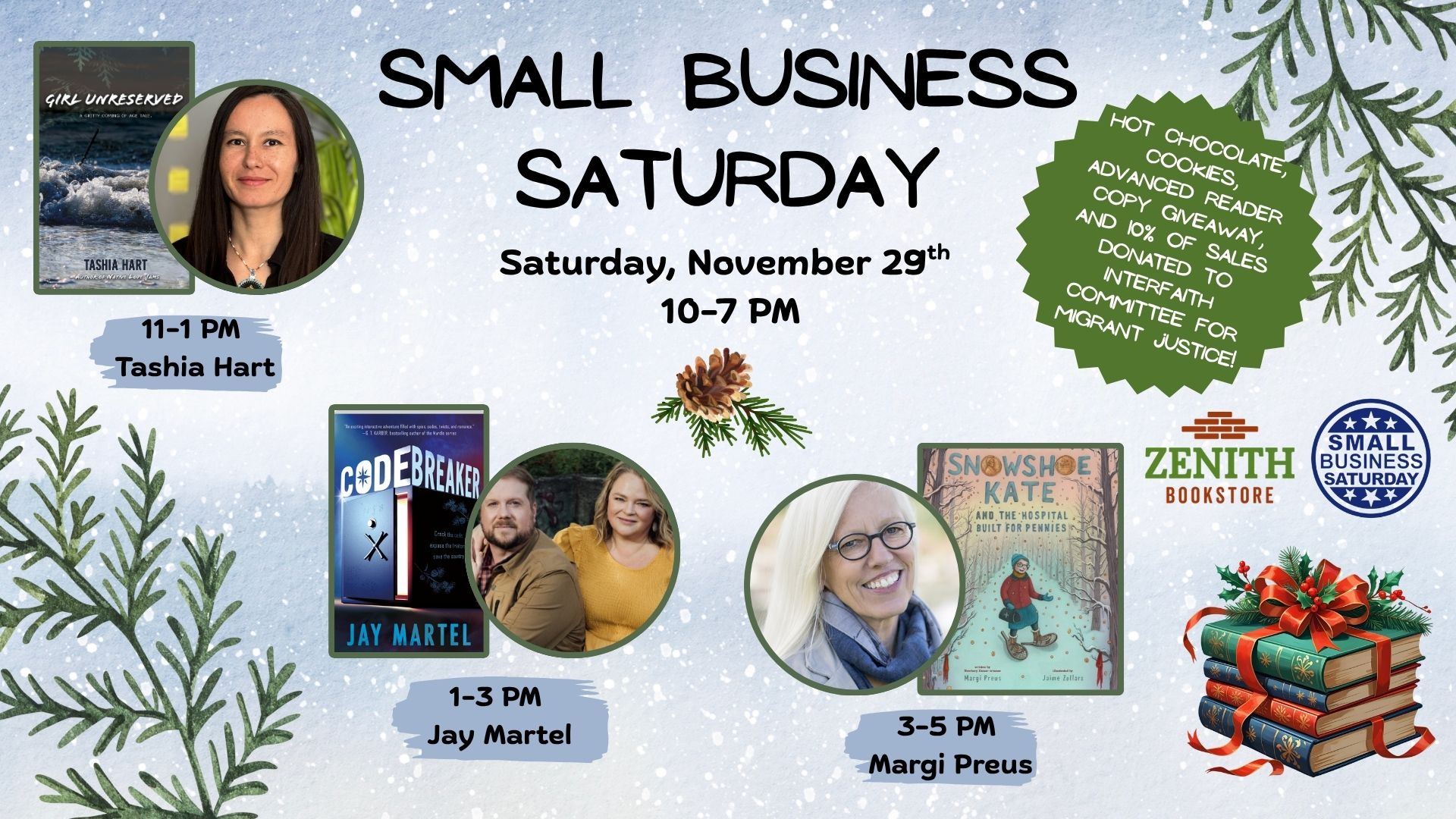 Join Zenith Bookstore for one of the biggest days of the year! Saturday, November 29th is Small Business Saturday, a time to support community and shopping local. Zenith will celebrate all day 10-7 PM with authors, hot chocolate, cookies, and Advanced Reader Copy giveaways. Plus, we will donate 10% of our sales to the Interfaith Committee for Migrant Justice. You will also be able to check out our Holiday Catalog and get the perfect gifts for everyone on your list.