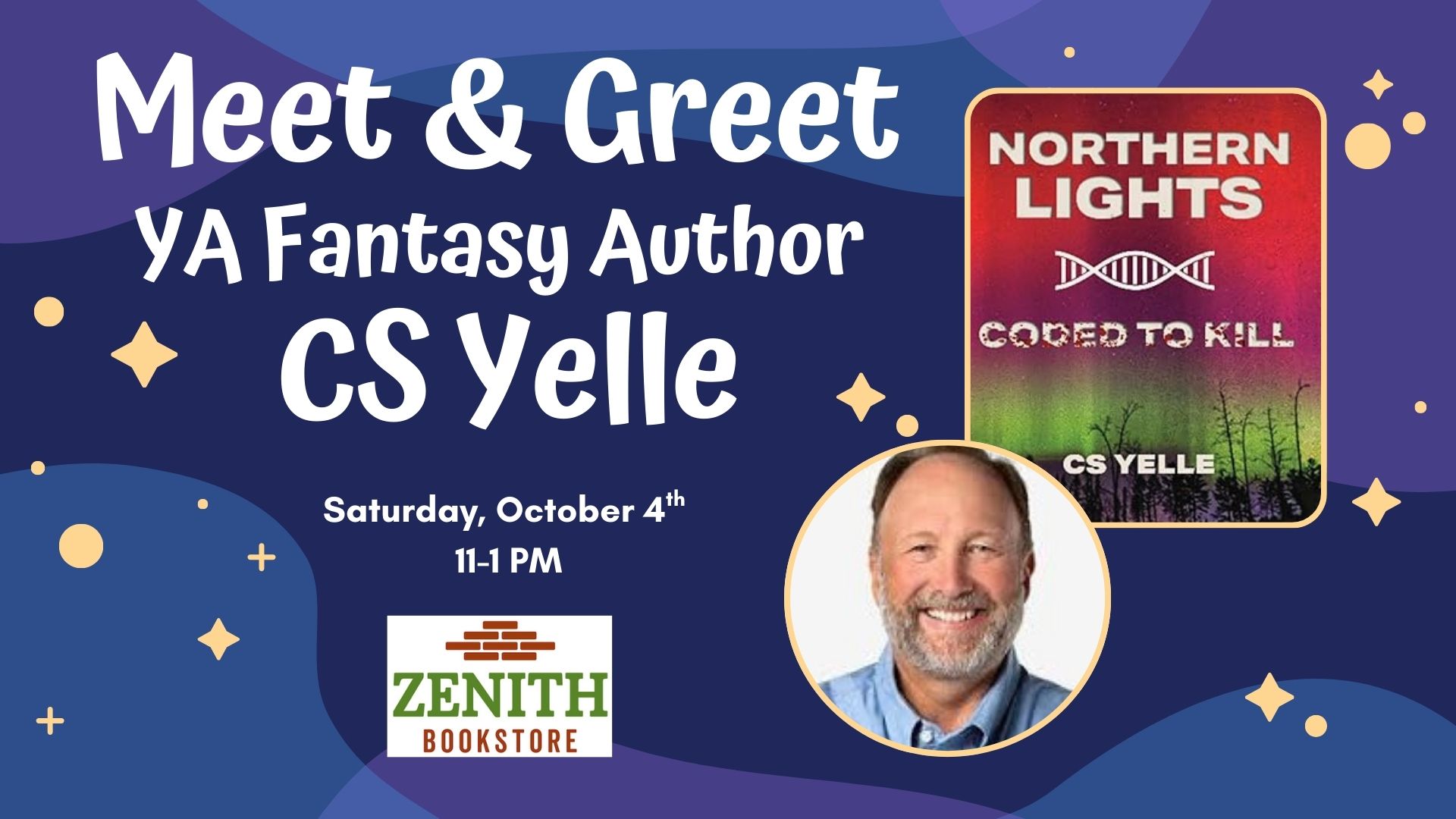 Join Zenith Bookstore for a Meet & Greet/Signing with northern Minnesota YA fantasy author CS Yelle on Saturday, Oct. 4th 11-1PM. He will be introducing his latest book, Northern Lights: Coded to Kill to Zenith readers. CS Yelle’s fantasy books are favorites with young adults and adults, alike.