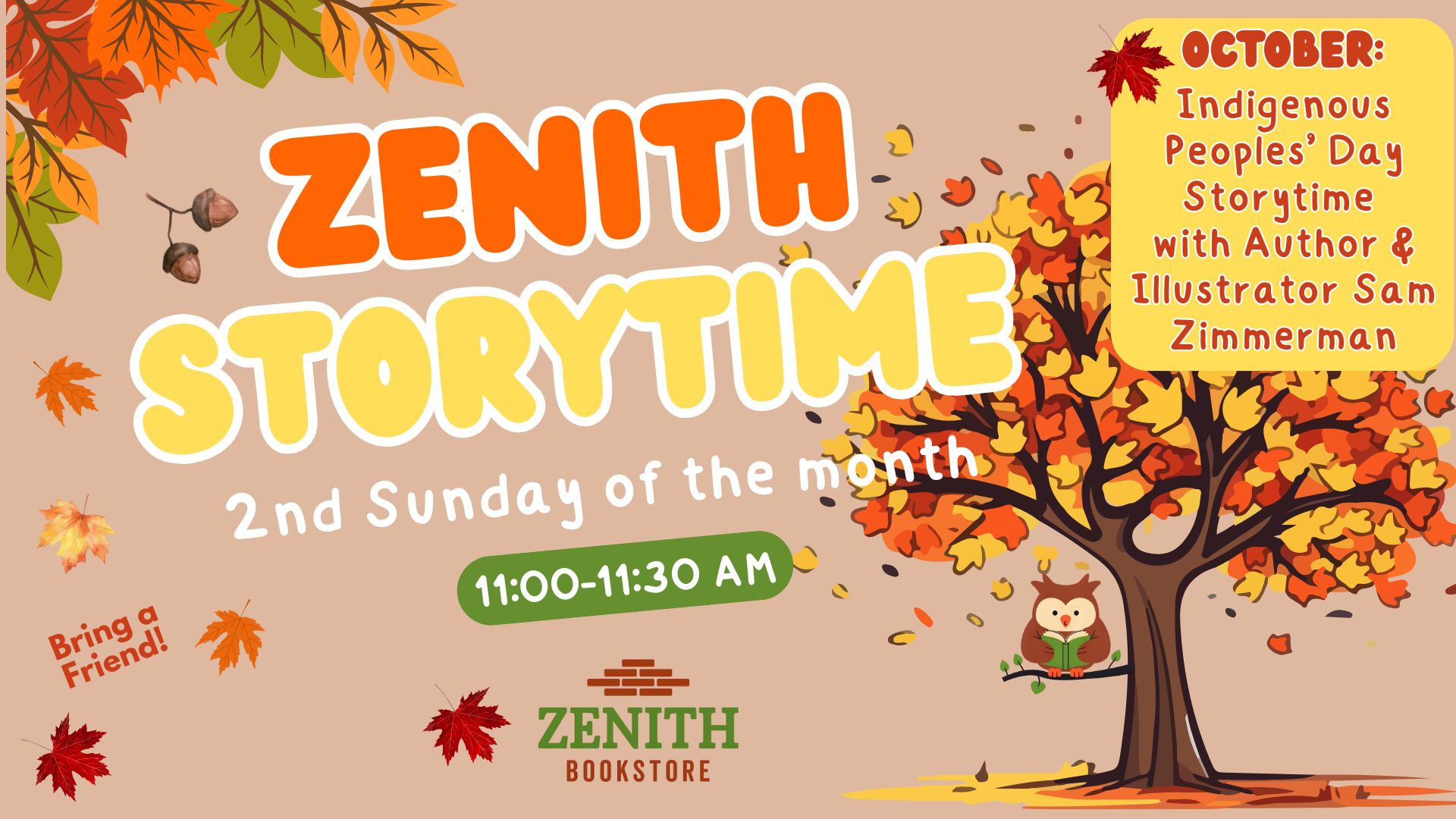 Join Zenith Bookstore for a special story time on Sunday, October 12th 11-11:30 am. Author and Illustrator, Sam Zimmerman will be our special guest. Sam will read from his book How the Birds Got Their Songs. He will also talk to kids about being an illustrator and share his book I am on Indigenous Land. This is geared towards kids in kindergarten and under. It is a free and family-friendly event. Cuddle up with your favorite blanket or stuffed animal and invite your friends!
