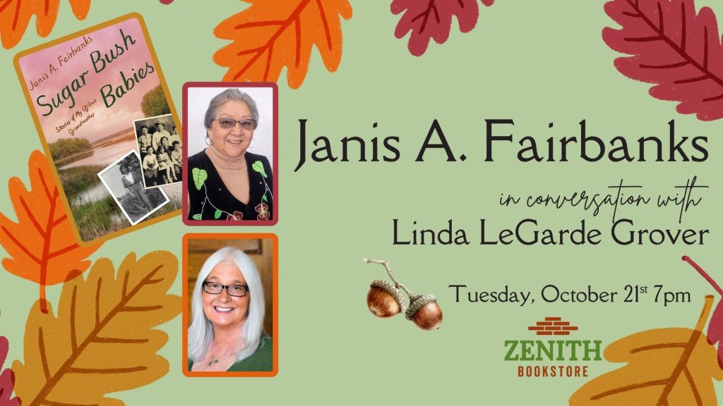 Join Zenith Bookstore for a thought-provoking evening of history on Tuesday, October 21st at 7pm. Janis A. Fairbanks will be in conversation with Linda LeGarde Grover for her new book, Sugar Bush Babies: Stories of My Ojibwe Grandmother. They will talk about her book, answer questions from the audience, and then personally autograph copies of it. This is the perfect event to bring a friend or perhaps your whole book club!