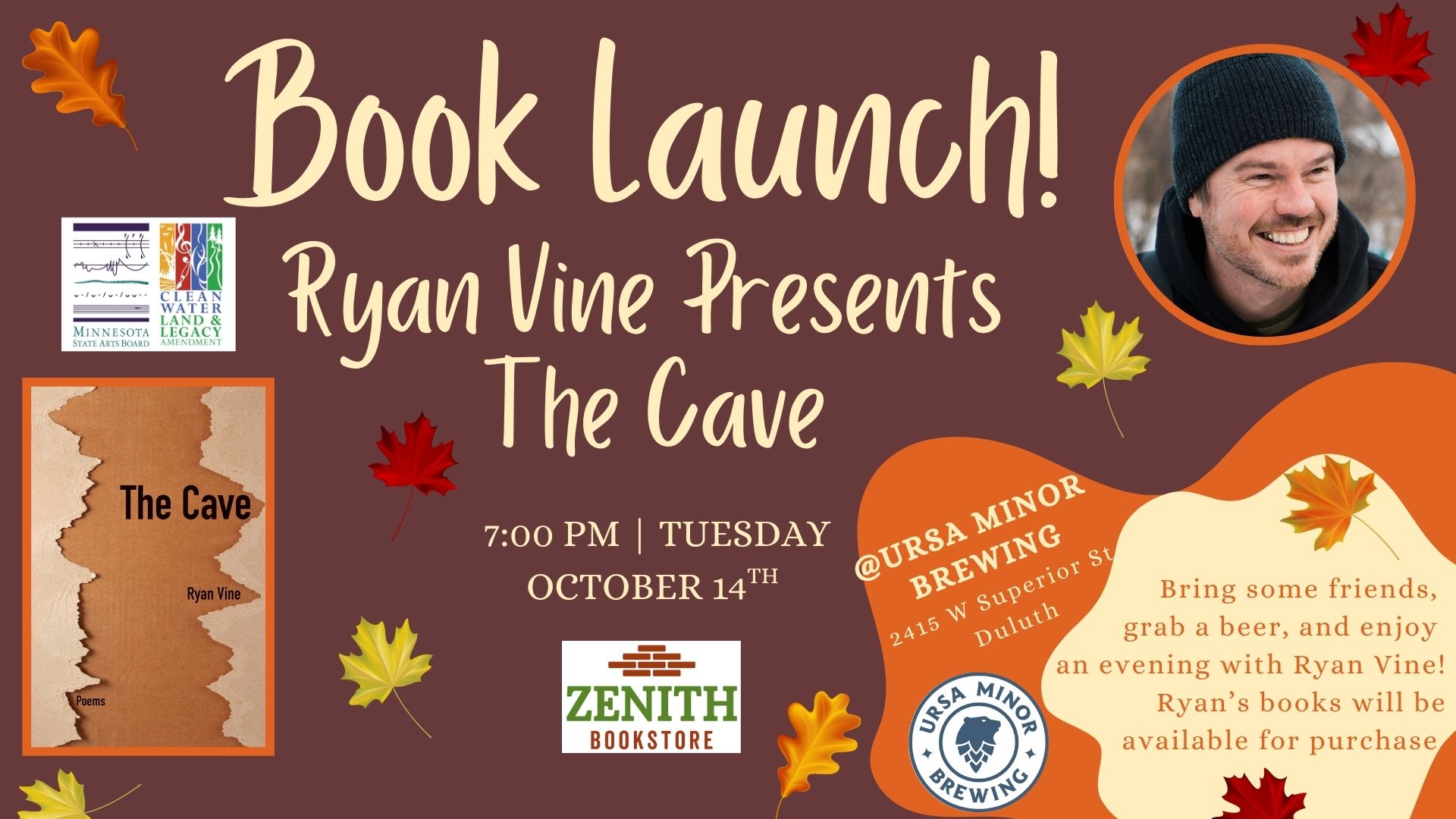 Join us as we celebrate the Book Launch for Ryan Vine’s The Cave: Poems (Texas Review Press). Zenith Bookstore will be hosting this event at Ursa Minor Brewing (2415 W. Superior St.) on Tuesday, October 14th at 7 PM. Bring a few friends, grab a beer, and enjoy this special evening with Ryan. He will share from his book, answer questions from the audience, and sign copies of The Cave, which will be available for purchase.