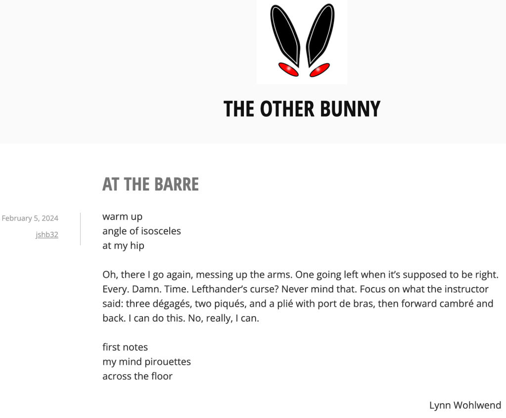 Prior to my interview with Wohlwend, I read her haibun poem titled “At the Barre,” which was published in an online poetry journal called The Other Bunny. A haibun is a traditional Japanese poem that combines prose and haiku poem styles. A haibun normally begins with a paragraph style text with one or more haiku poems following.